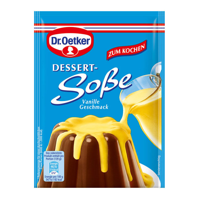 Mit Dr. Oetker Dessert-Soße Vanille-Geschmack zum Kochen können Sie viele Desserts optimal verfeinern. Wahlweise heiß oder kalt serviert, ist die Dr. Oetker Dessert-Soße Vanille-Geschmack zum Kochen ein wahrer Genuss. Sie wird mit 500 ml Milch und 40 g Zucker aufgekocht. Der feine Vanille-Geschmack gibt Desserts, Eis, Kuchen und Gebäck die ganz besondere Note