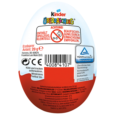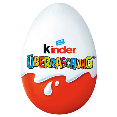 Überraschungsei aus Weißer- und Vollmilchschokolade mit Spielzeug und Figur in jedem 7. Ei, immer die neueste Serie. Das Ei besteht aus 20 g Schokolade in Form einer zweilagigen Hülle, außen braun, innen weiß. Im Inneren des Eies befindet sich in einer meist gelben Plastikverpackung eine Gimmick-Figur oder ein kleiner Bausatz. Einige der Figuren aus den Überraschungseiern sind bei Sammlern begehrt